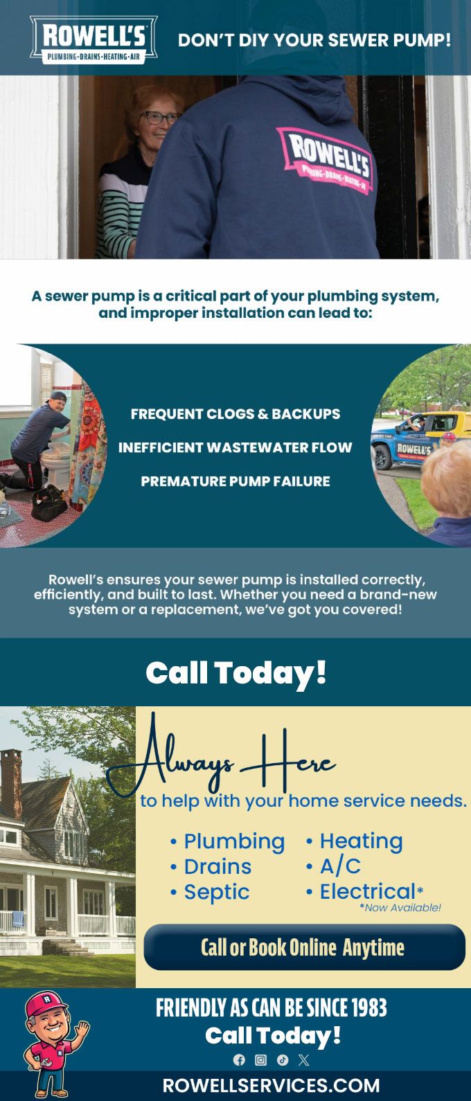 "Friendly As Can Be Since 1983!" When you need help with your plumbing, drains, heating, cooling or electrical in Farmington, you can always rely on Rowell's Services! Call us now or book online!