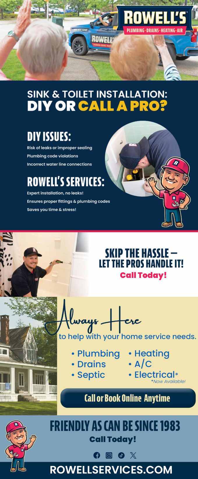 "Friendly As Can Be Since 1983!" When you need help with your plumbing, drains, heating, cooling or electrical in Farmington, you can always rely on Rowell's Services! Call us now or book online!